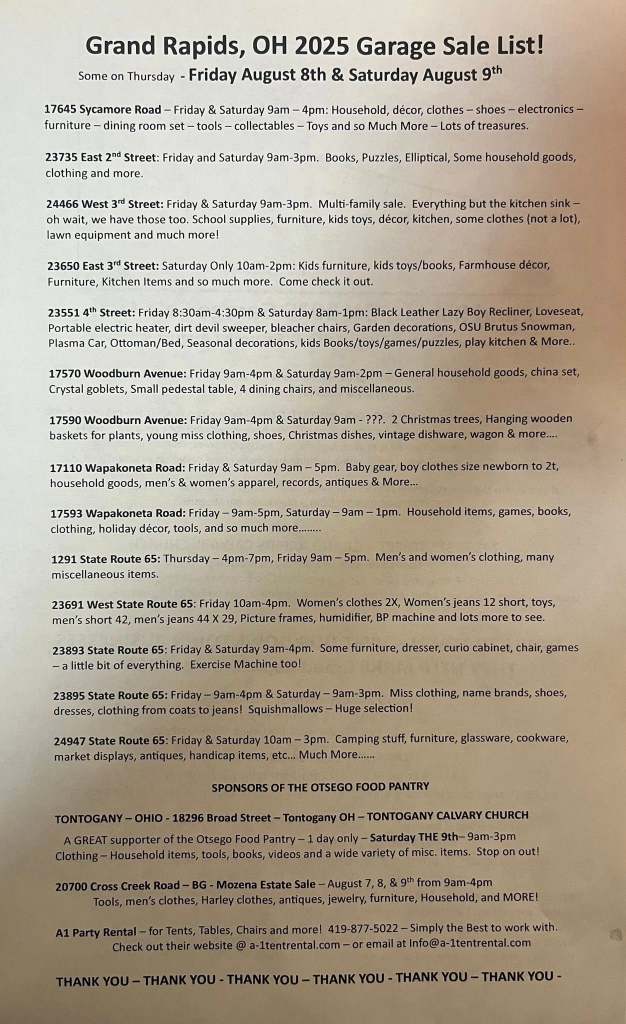 GRAND RAPIDS, OH – Bargain hunters, collectors, and summer shoppers will want to mark their calendars for Friday, August 8th and Saturday, August 9th, as Grand Rapids, Ohio, hosts its annual Community Garage Sale Weekend.